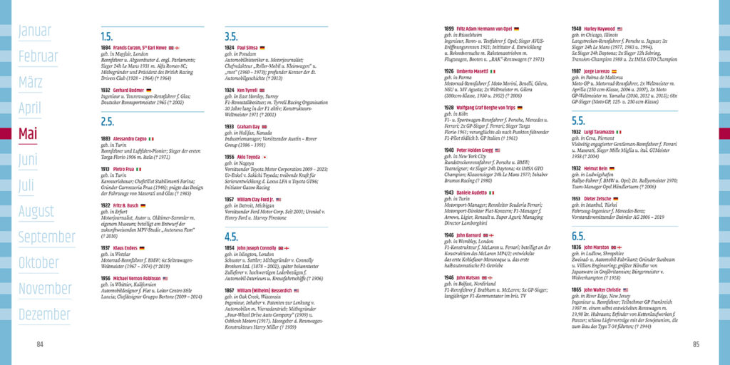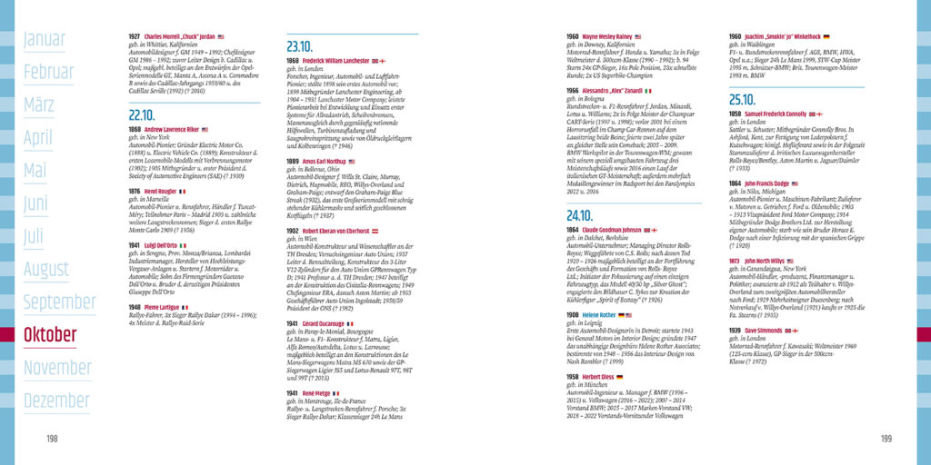 Für alle, die neugierig auf weitere „Car Guys“ geworden sind, gibt es jetzt ein in Umfang und Inhalt einzig-artiges Nachschlagewerk: Auto zeitung-Autor Karsten Rehmann listet in seinem „Car Guys Kalender“ rund 2000 bedeutende Personen der Auto- und Motorradgeschichte nach ihren Geburtsdaten auf und liefert auf ca. 250 Seiten die wichtigsten biografischen Informationen über Pioniere und Firmengründer, Konstrukteure, Designer und Rennfahrer/innen. Der „Car Guys Kalender“ kostet 60 Euro und ist ab sofort bei imd-motorsport.de bestellbar. ISBN 978-3-9825637-2-5.