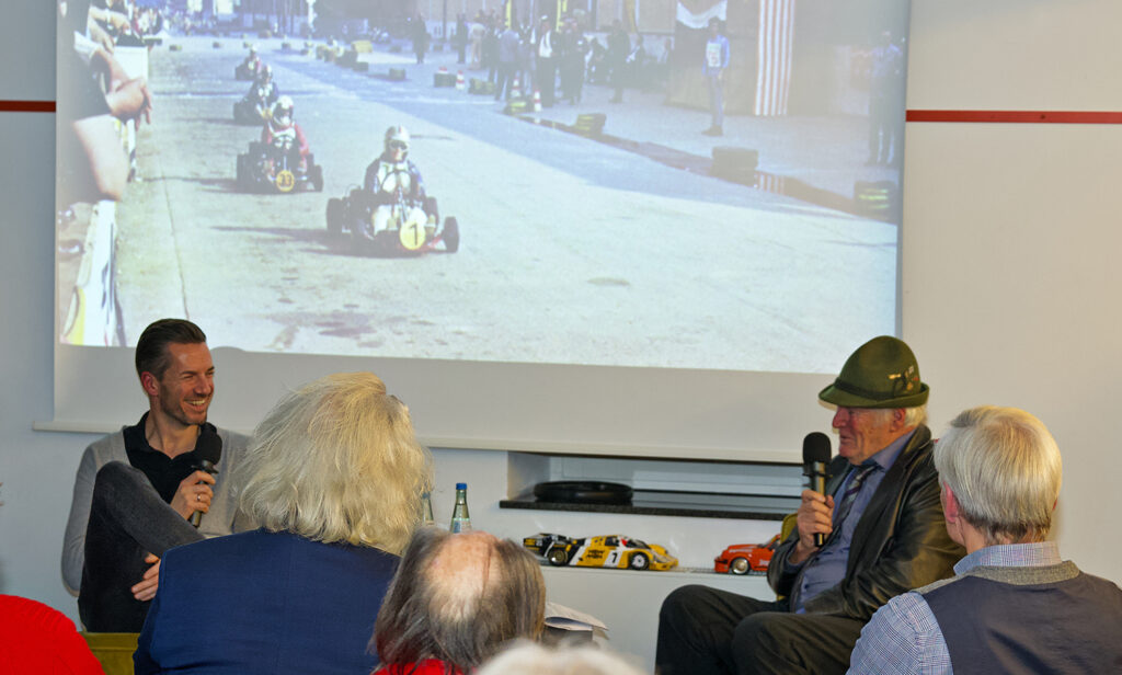 Prof. Dr. Herrmann gab das Wort weiter an Sven Salzmann, Vizepräsident und Aktiver des Kart Klubs Kerpen (KCK). Salzmann startete international meist in der Schaltkart-Kategorie und nahm mehrmals an der Kart-Weltmeisterschaf teil. Der KCK-Repräsentant unterhielt sich mit Hans Heyer über dessen Einstieg vom Kart- in den Motorsport. Den interessierten Zuhörern wurde die stetige Entwicklung des Kartsports in den vergangenen 50 Jahren, in denen sich diese Sportdisziplin zu einer konkurrenzfähigen Form des Motorsports entwickelt hat, somit bestens vermittelt.